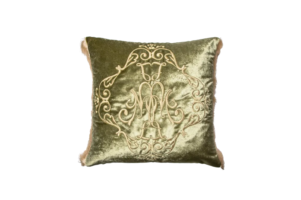 Kwadratowa poduszka w nietypowym oliwkowym odcieniu zachwyca złotym, połyskującym haftem oraz frędzlem w tym samym kolorze, tworząc elegancką i bogatą kompozycję, idealną jako luksusowy akcent dekoracyjny.