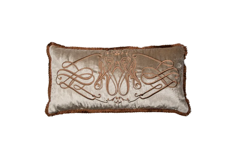 Beżowa poduszka prostokątna z ciemnym brązowym wykończeniem, krótkim puchem i wyrazistym haftem to mocna, dekoracyjna propozycja do wnętrz. Kontrastowe detale dodają jej charakteru, tworząc elegancki i efektowny akcent, który przyciąga wzrok i podkreśla styl aranżacji.
